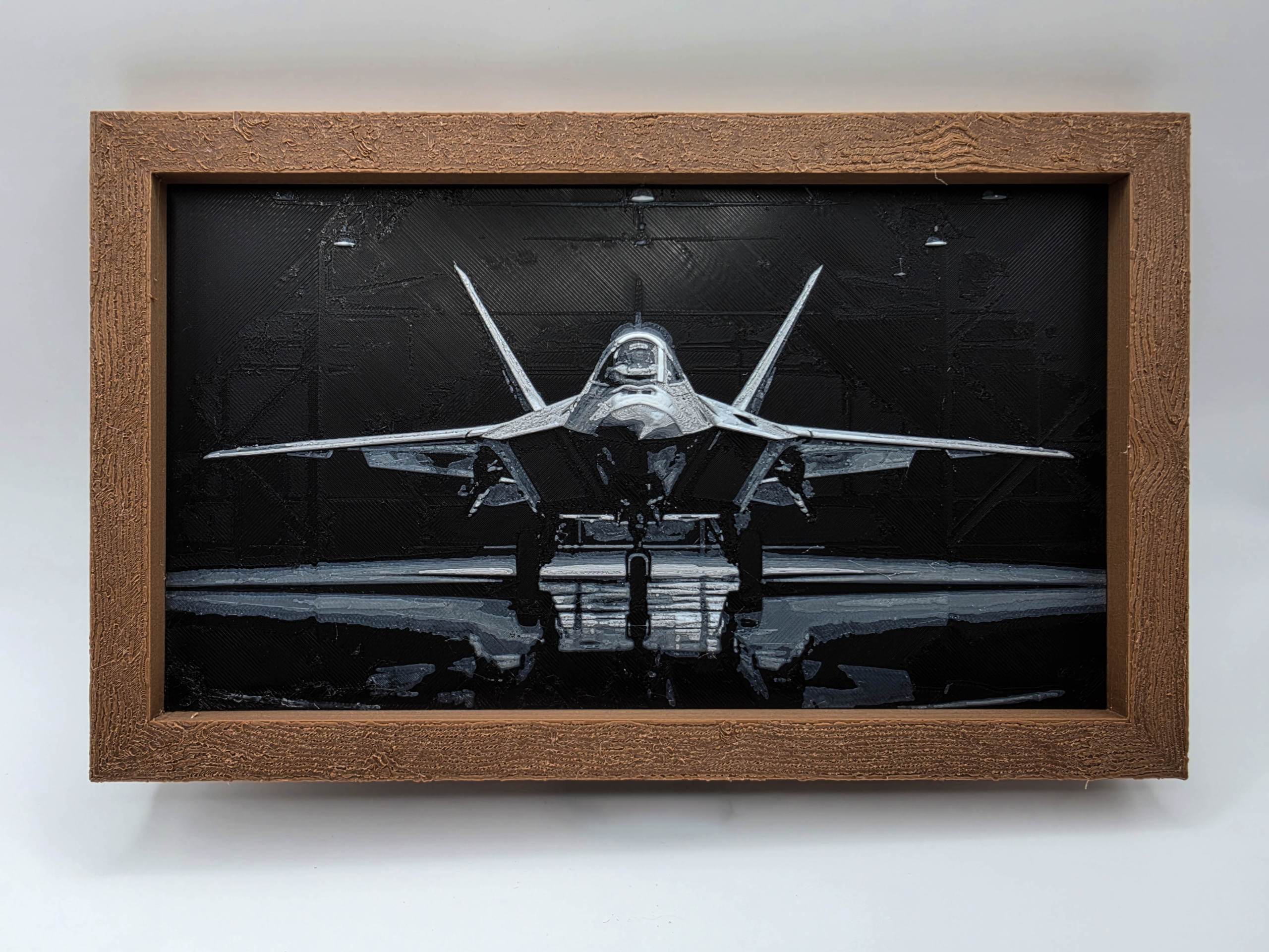 Tactile Depth: Features high-relief FDM layering where the jet’s nose and wings are physically elevated, creating dynamic shadows that shift based on your room’s lighting. Why This Piece Unlike a flat poster, this F-22 tribute is a tactile experience. Built layer-by-layer through FDM (Fused Deposition Modeling), the “brushstrokes” are actual lines of molten polymer that have cooled into a permanent, durable 3D structure. The result is a piece of aviation art that invites you to run your fingers across the wings, making it a rugged, modern conversation starter for any office or hangar.