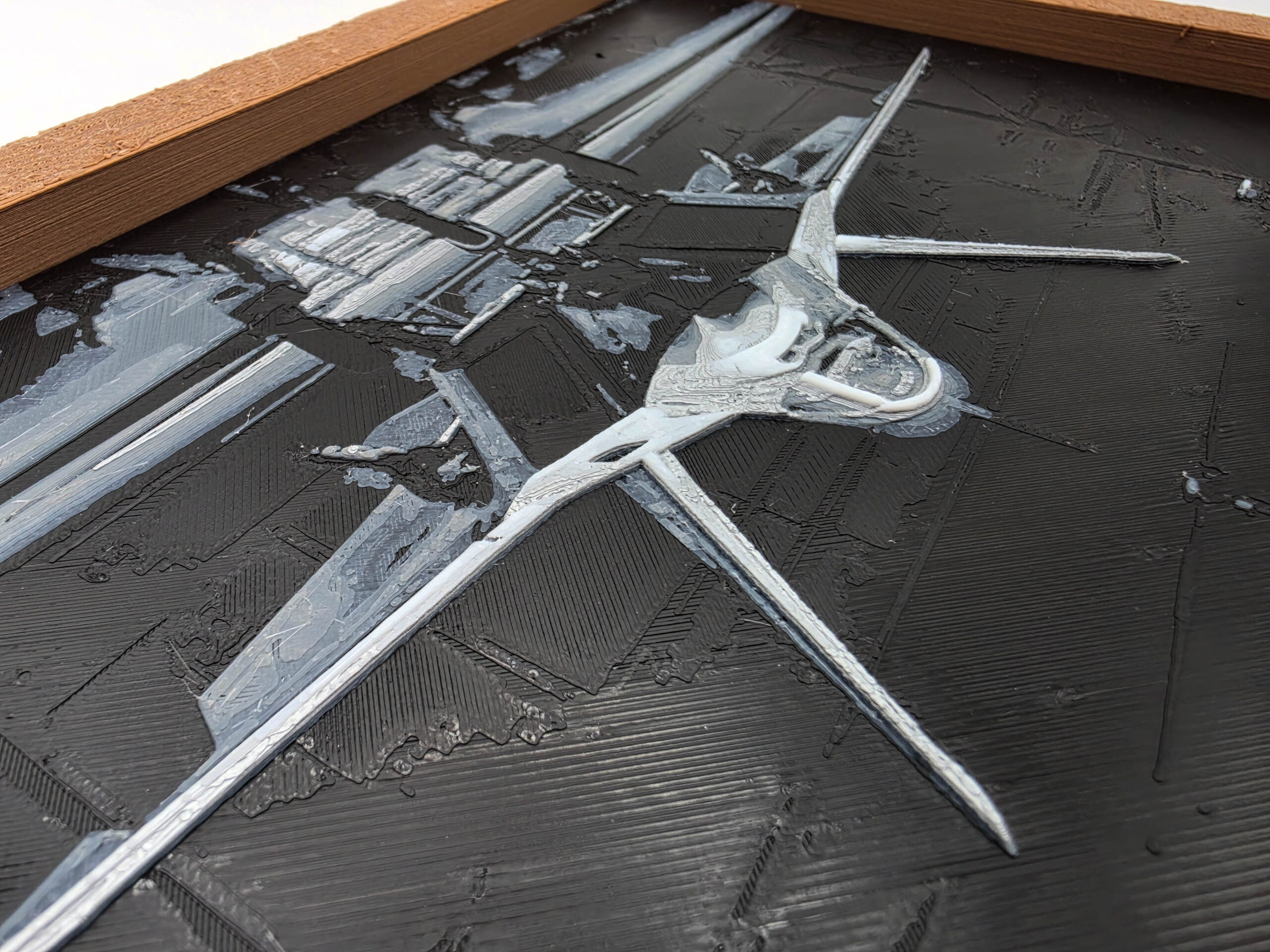 F-22 Raptor High-Relief Filament Painting This striking piece reimagines the F-22 Raptor through the lens of additive manufacturing, creating a “painted with plastic” aesthetic that leaps off the surface. The meticulous layering of filament captures the aggressive silhouette of the stealth fighter with a physical depth that traditional photography cannot replicate. Product Specifications Dimensions: Art insert is 9.8″ x 5.5″ (250mm x 140mm); total footprint with frame is 11.1″ x 6.7″ (281mm x 170mm).