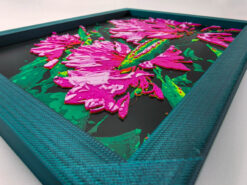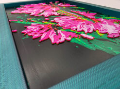This isn’t a flat print; it is a high-relief “painting” sculpted with molten plastic. The vibrant pink petals and lush greenery are built layer by layer, creating a striking 3D texture that catches the light and demands to be touched. Product Specifications Dimensions: The inner art measures 8.6″ x 4.8″ (220mm x 123mm), while the framed footprint is 9.8″ x 7″ (250mm x 178mm).